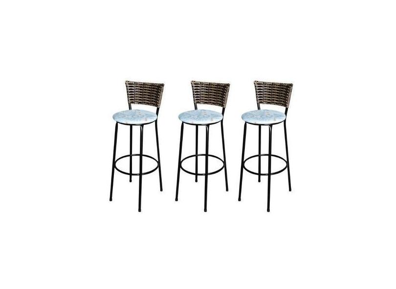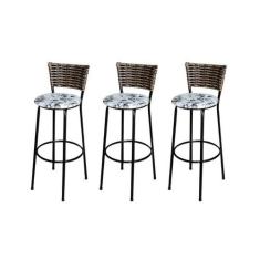 Jogo 3 Banqueta Alta Para Cozinha Ratan Cappuccino Preta Estofado Flor