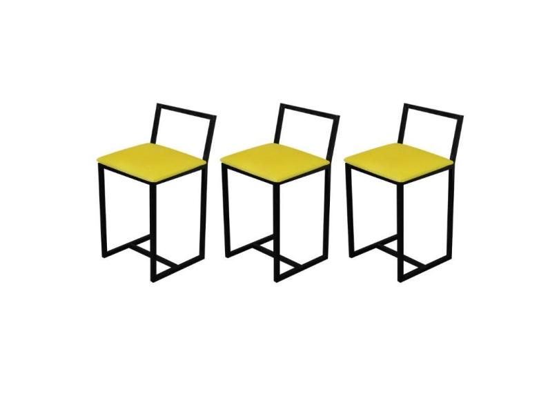 Jogo 3 Banqueta Baixa Para Cozinha Preta Industrial Estofado Amarelo