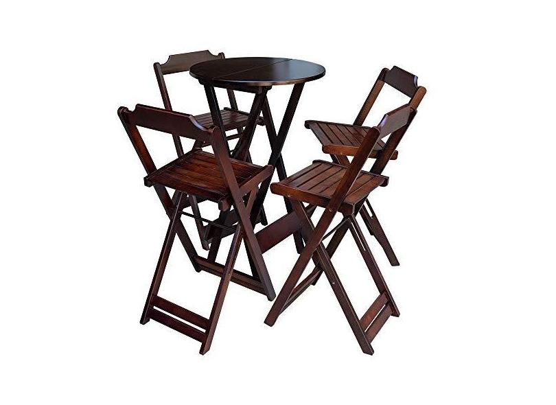 O menor preço encontrado no Brasil para JOGO DE MESA BISTRÔ DOBRÁVEL EM MADEIRA MACIÇA COM 4 BANQUETAS ALTAS - IMBUIA atualmente é R$ 562,59.