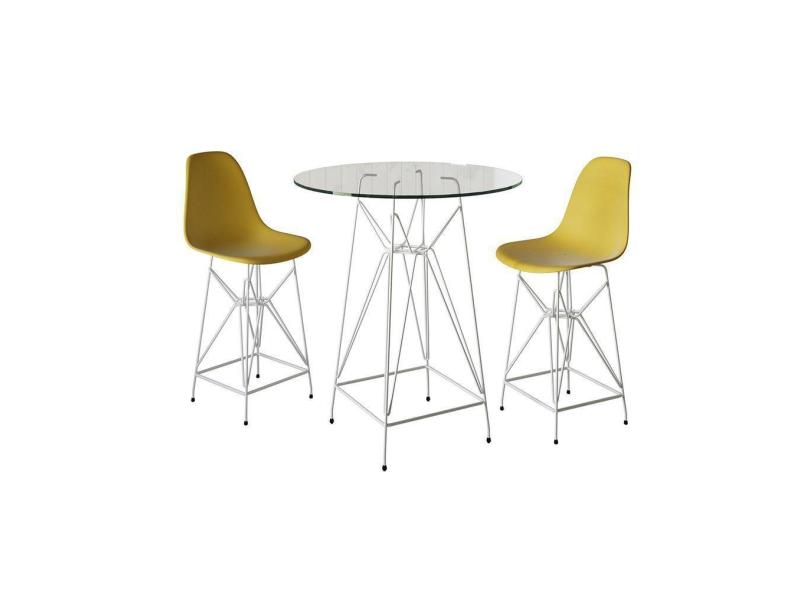 Jogo Mesa Bistrô Eames Vidro 60Cm 2 Banquetas Amarela Base Ferro Branco - Cor: Branco