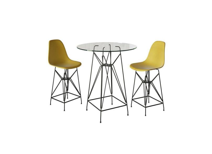 Jogo Mesa Bistrô Eames Vidro 60Cm 2 Banquetas Amarela Base Ferro Preto - Cor: Branco