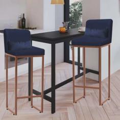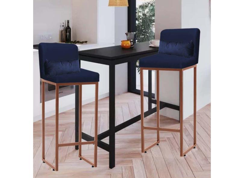 Kit 02 Banqueta Alta com Encosto Lucca Industrial Cozinha Balcão Ferro Bronze Suede Azul Marinho e Almofada Azul Marinho - Ahazzo Móveis