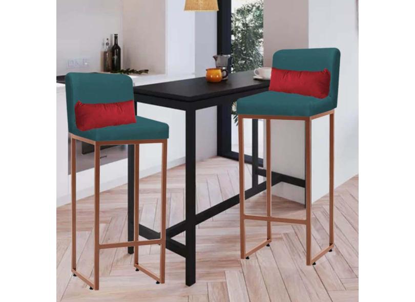 Kit 02 Banqueta Alta com Encosto Lucca Industrial Cozinha Balcão Ferro Bronze Suede Azul Turquesa e Almofada Vermelho - Ahazzo Móveis