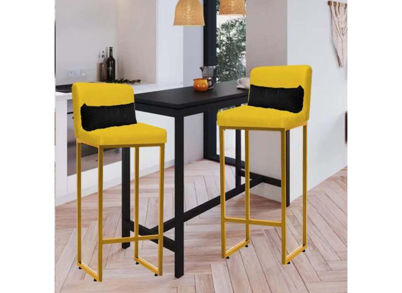 Kit 02 Banqueta Alta com Encosto Lucca Industrial Cozinha Balcão Ferro Dourado Corino Amarelo e Almofada Preto - Ahazzo Móveis