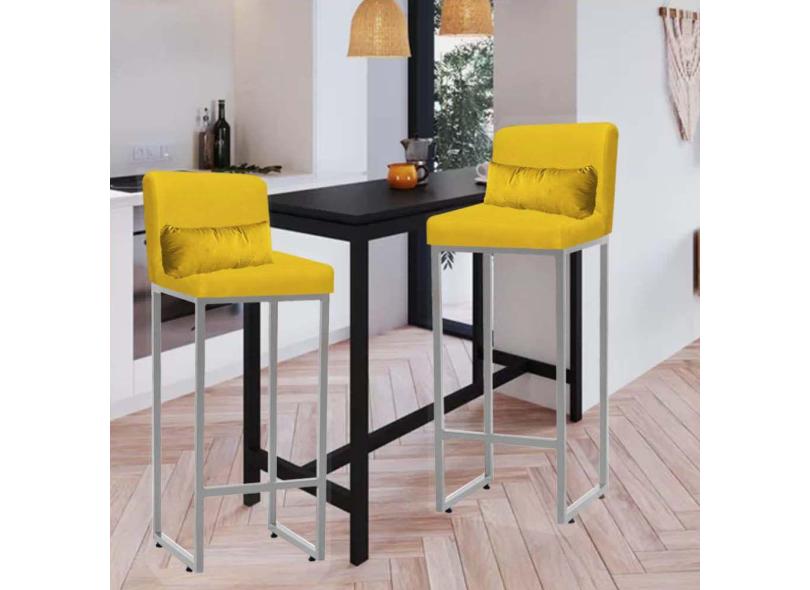 Kit 02 Banqueta Alta com Encosto Lucca Industrial Cozinha Balcão Ferro Prata Corino Amarelo e Almofada Amarelo - Ahazzo Móveis