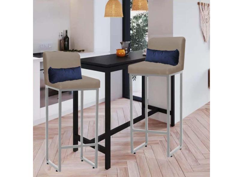 Kit 02 Banqueta Alta com Encosto Lucca Industrial Cozinha Balcão Ferro Prata Corino Bege e Almofada Azul Marinho - Ahazzo Móveis