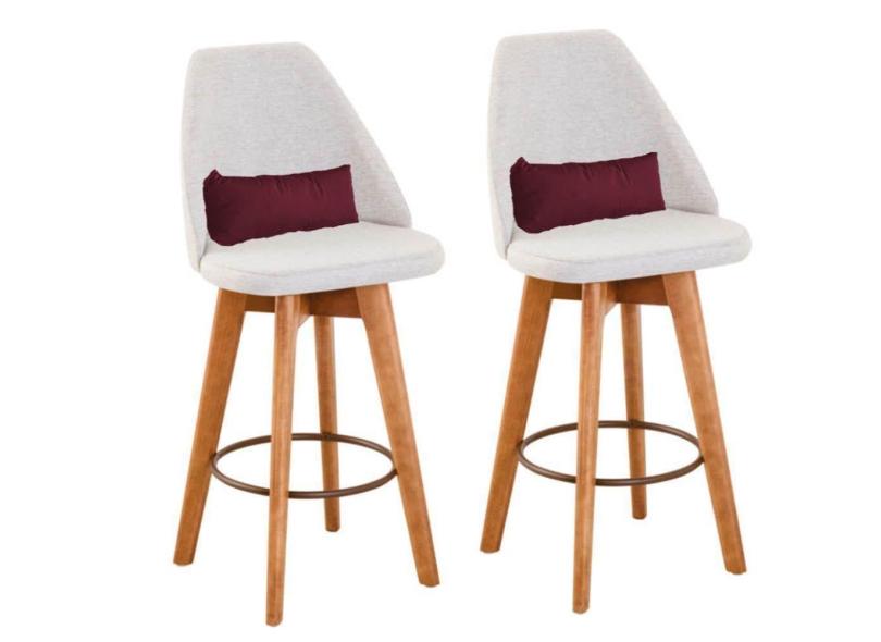 Kit 02 Banquetas Alta Maya Giratória Com Encosto Linho Bege Claro e Almofada Sintético Bordô - Aurora Line