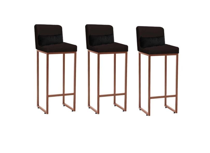 Kit 03 Banqueta Alta com Encosto Lucca Industrial Cozinha Balcão Ferro Bronze Corino Marrom e Almofada Preto - Ahazzo Móveis