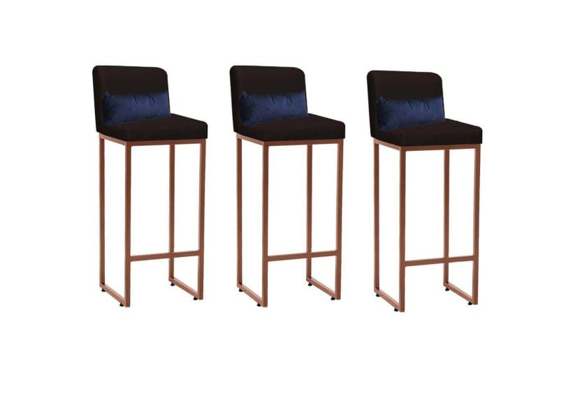 Kit 03 Banqueta Alta com Encosto Lucca Industrial Cozinha Balcão Ferro Bronze Sintético Marrom e Almofada Azul Marinho - Ahazzo Móveis