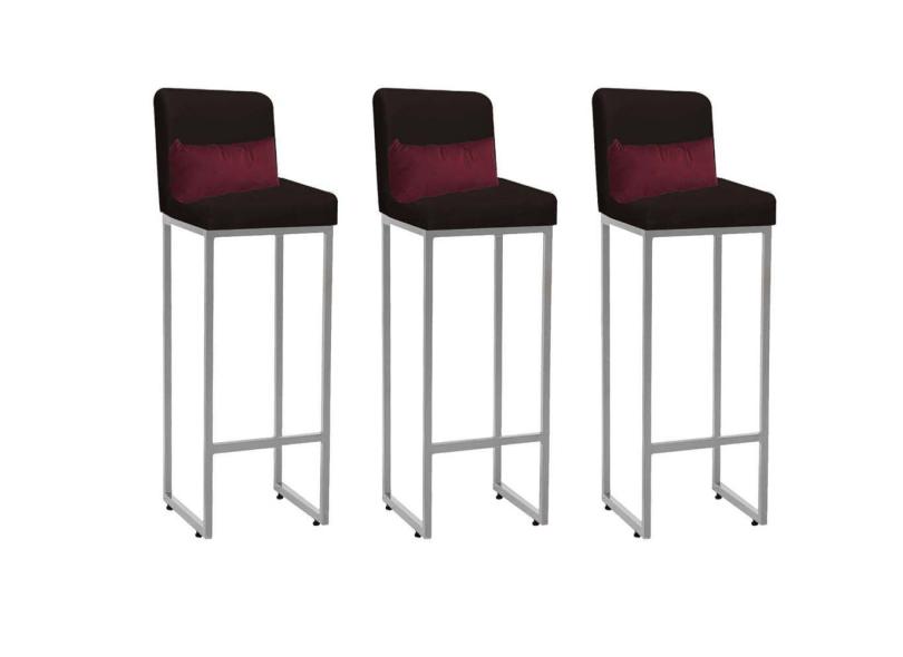 Kit 03 Banqueta Alta com Encosto Lucca Industrial Cozinha Balcão Ferro Cinza Suede Marrom e Almofada Bordô - Ahazzo Móveis