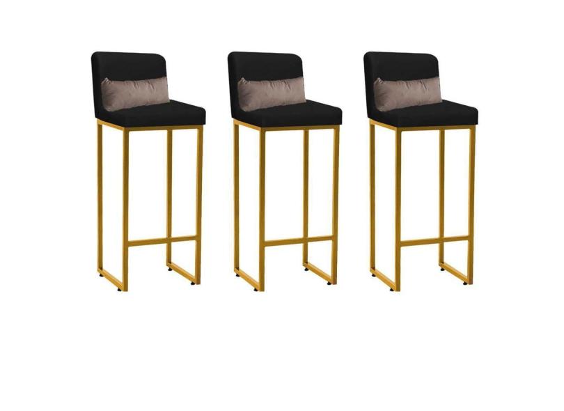 Kit 03 Banqueta Alta com Encosto Lucca Industrial Cozinha Balcão Ferro Dourado Corino Preto e Almofada Bege - Ahazzo Móveis