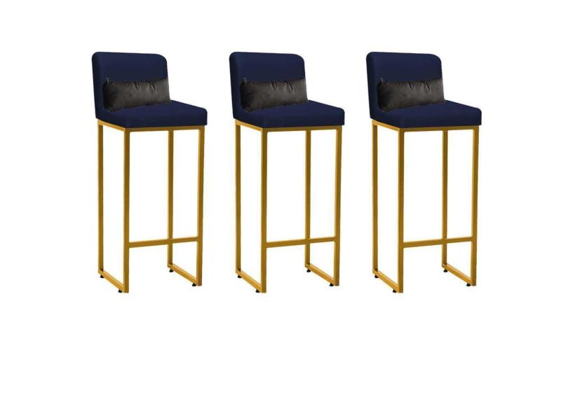 Kit 03 Banqueta Alta com Encosto Lucca Industrial Cozinha Balcão Ferro Dourado Sintético Azul Marinho e Almofada Cinza - Ahazzo Móveis