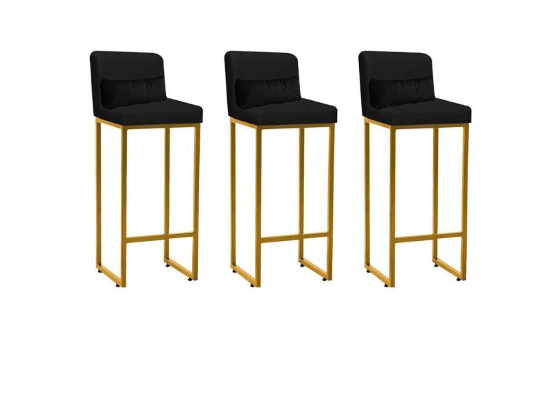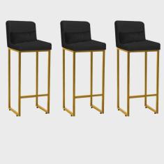 Kit 03 Banqueta Alta com Encosto Lucca Industrial Cozinha Balcão Ferro Dourado Suede Preto e Almofada Preto - Ahazzo Móveis