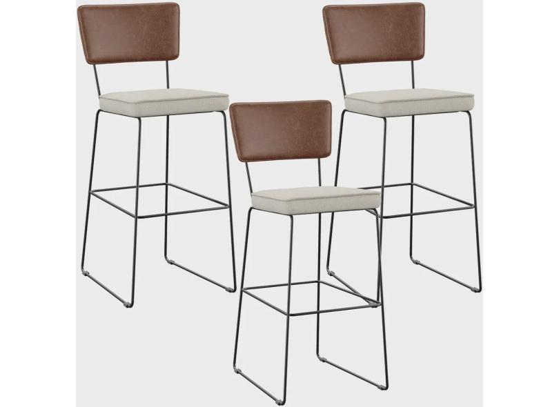 Kit 03 Banqueta Alta Cozinha Sala Jantar Allana L02 Couríssimo Marrom Linho Champagne - Lyam Decor