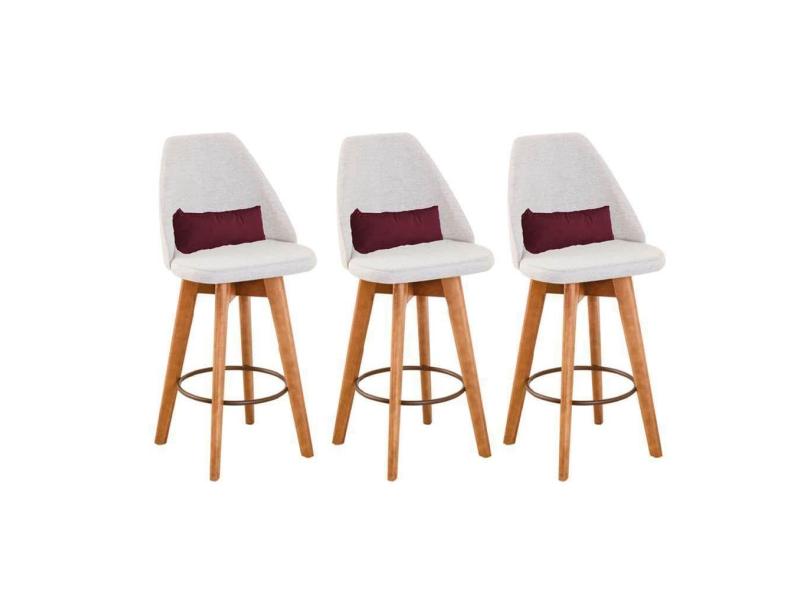 Kit 03 Banquetas Alta Maya Giratória Com Encosto Linho Bege Claro e Almofada Corino Bordô - Aurora Line