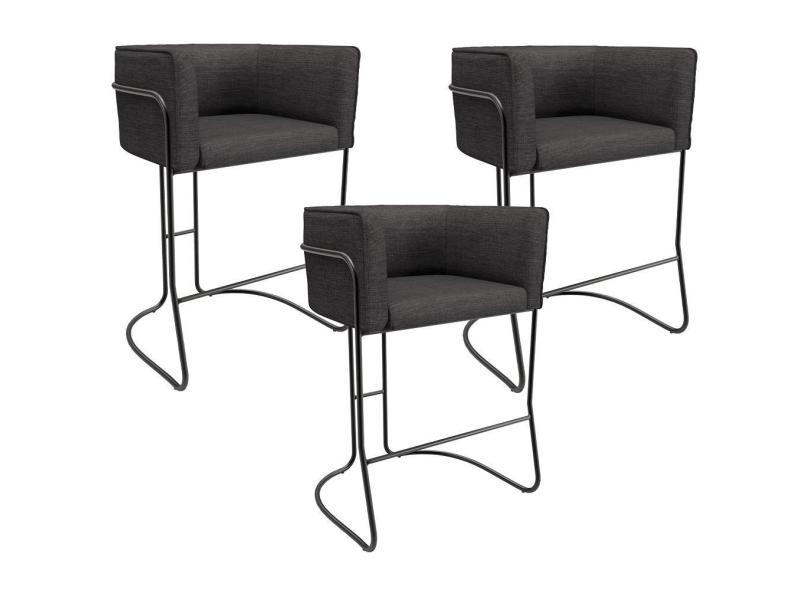 Kit 03 Banquetas Baixa Base de Aço Preto Betina D02 Linho Cinza Escuro C-416 - Lyam Decor