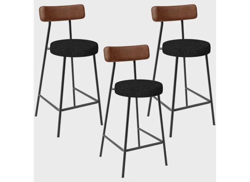 Kit 03 Banquetas Baixa Cozinha Sala De Jantar Milão L02 Couríssimo Marrom Linho Chumbo - Lyam Decor