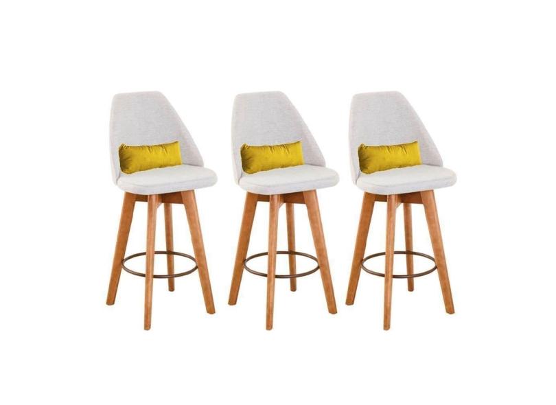Kit 03 Banquetas Com Encosto Linho Bege E Almofada Amarelo