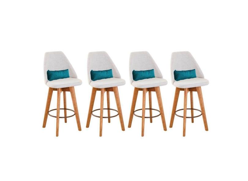 Kit 04 Banquetas Alta Maya Giratória Com Encosto Linho Bege Claro e Almofada Suede Azul Turquesa - Aurora Line
