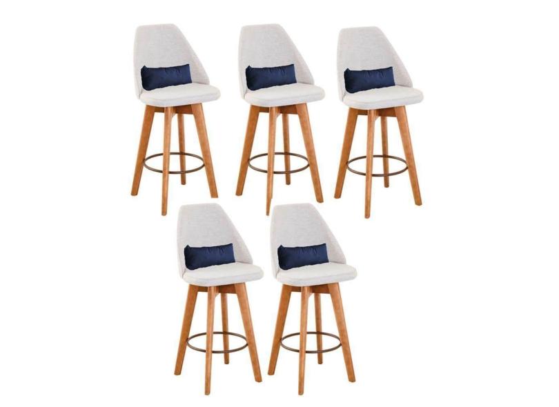 Kit 05 Banquetas Alta Maya Giratória Com Encosto Linho Bege Claro e Almofada Corino Azul Marinho - Aurora Line