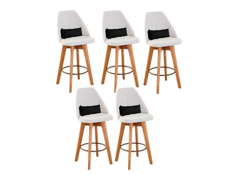 Kit 05 Banquetas Alta Maya Giratória Com Encosto Linho Bege Claro e Almofada Sintético Preto - Aurora Line
