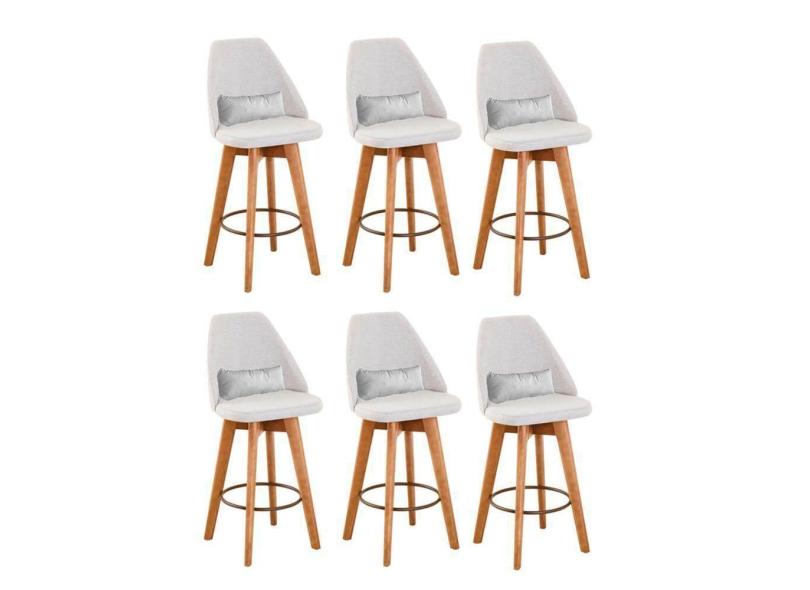 Kit 06 Banquetas Alta Maya Giratória Com Encosto Gourmet Linho Bege e Almofada Corino Branco - Aurora Line