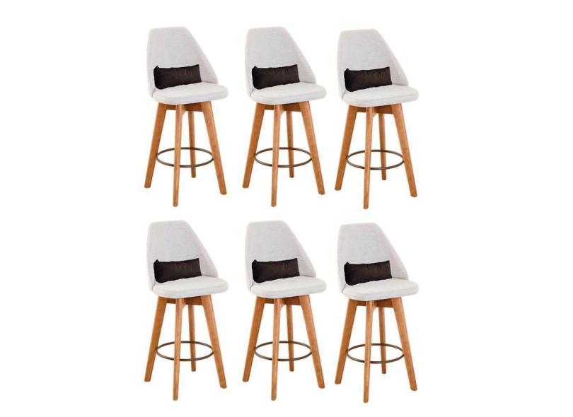 Kit 06 Banquetas Alta Maya Giratória Com Encosto Linho Bege Claro e Almofada Corino Marrom - Aurora Line