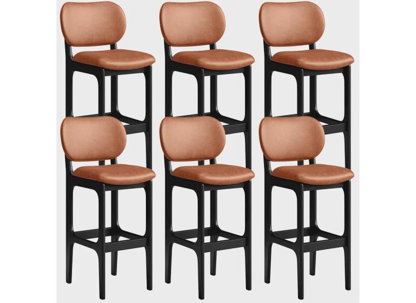 Kit 06 Banquetas Alta Para Cozinha Madeira Fixa Betta L02 Preto Couríssimo Camel - Lyam Decor