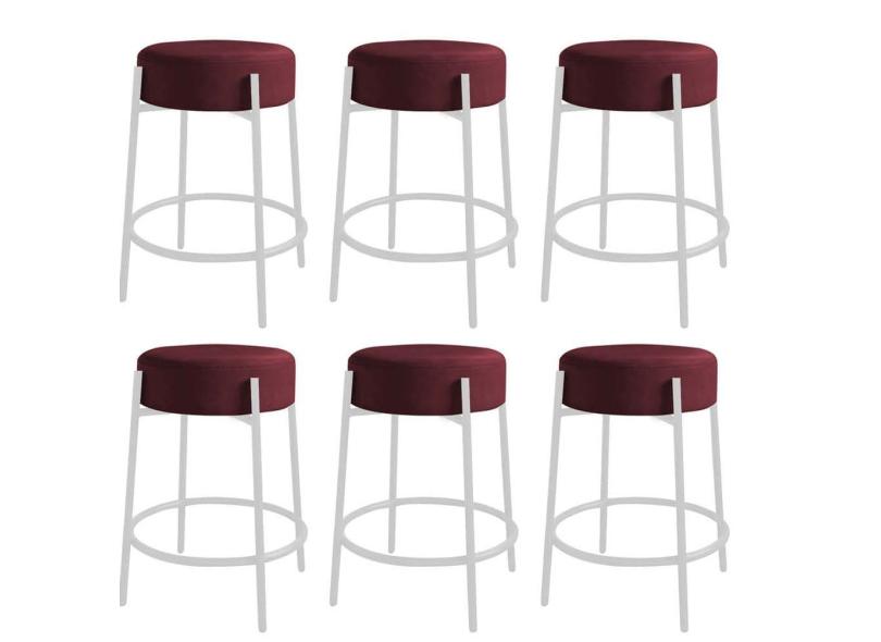 Kit 06 Banquetas Alta Sintra 65cm Redonda Ferro Branco Suede Bordô - Ahazzo Móveis
