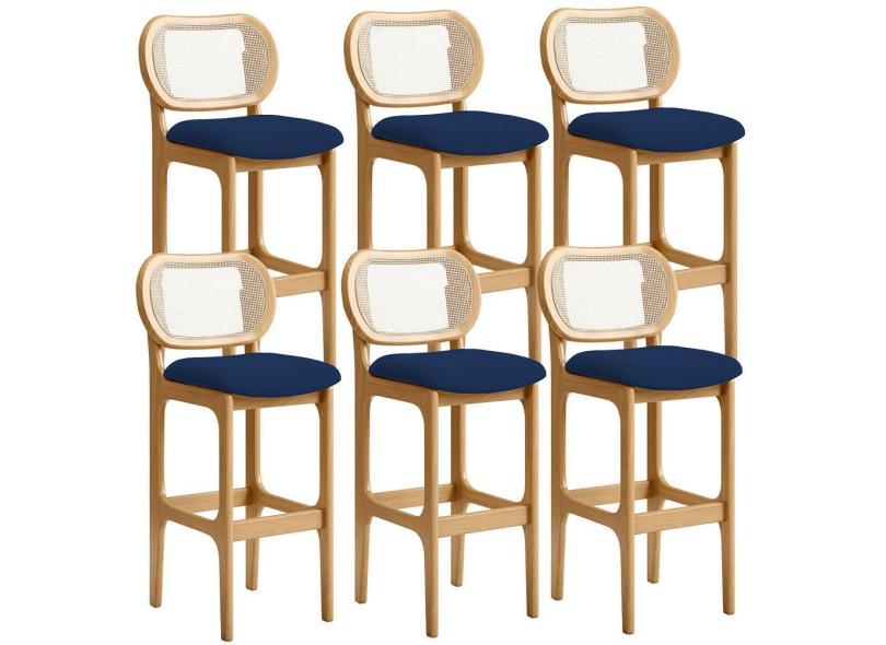 Kit 06 Banquetas Altas Para Cozinha Bancada Sala Tela Betta Fixa L02 Suede Azul Marinho - Lyam