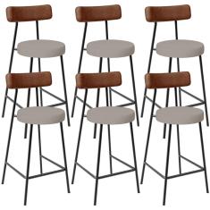 Kit 06 Banquetas Baixa Cozinha Sala De Jantar Milão L02 Couríssimo Marrom Linho Cinza - Lyam Decor