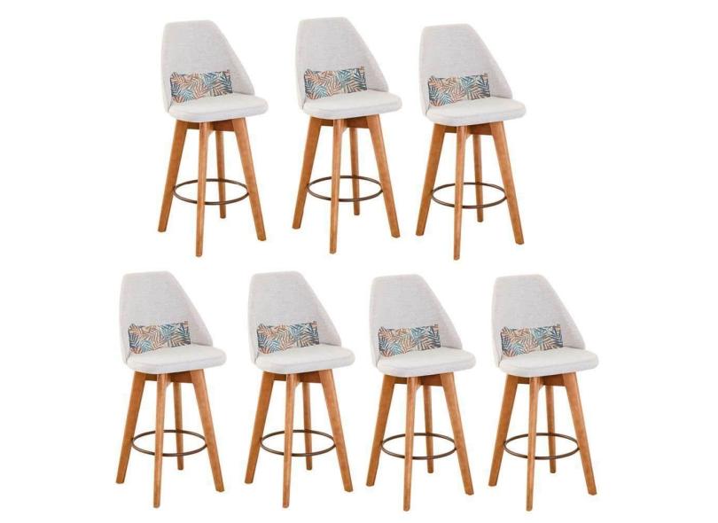 Kit 07 Banquetas Alta Maya Giratória Com Encosto Gourmet Linho Bege e Almofada Folhas - Aurora Line