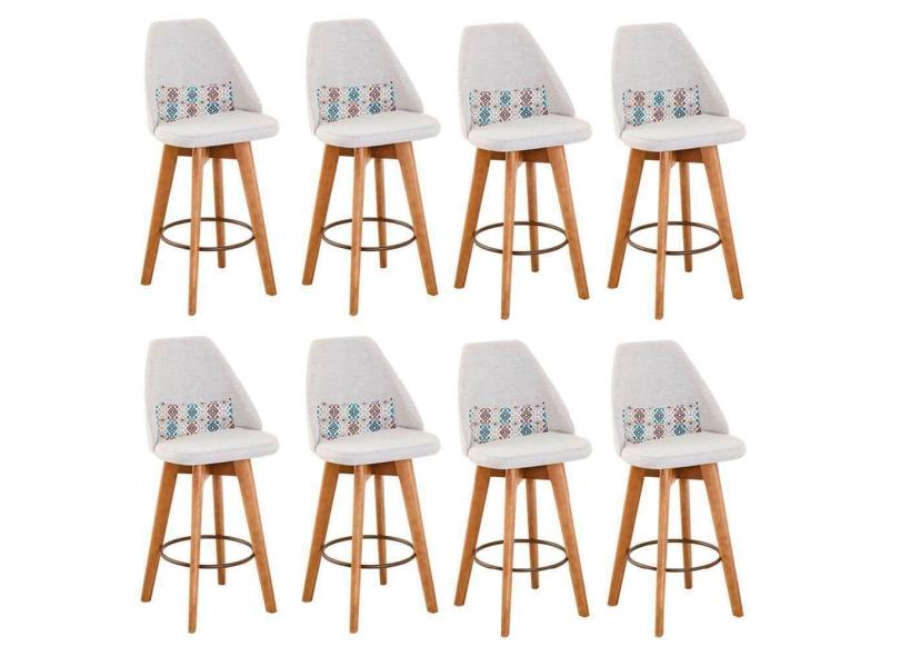 Kit 08 Banquetas Alta Maya Giratória Com Encosto Gourmet Linho Bege e Almofada Mosaico - Aurora Line