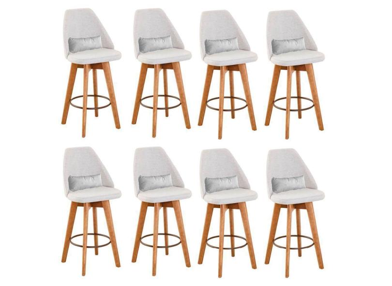 Kit 08 Banquetas Alta Maya Giratória Com Encosto Linho Bege Claro e Almofada Sintético Branco - Aurora Line
