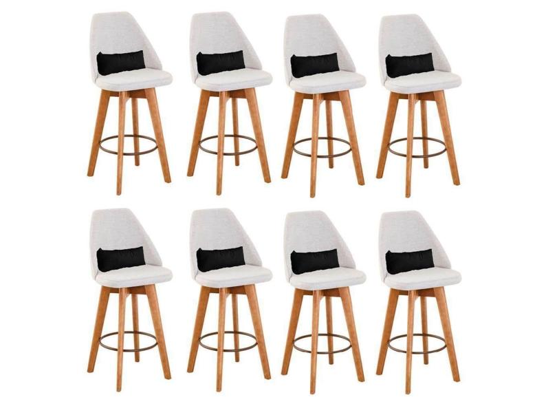 Kit 08 Banquetas Alta Maya Giratória Com Encosto Linho Bege Claro e Almofada Suede Preto - Aurora Line