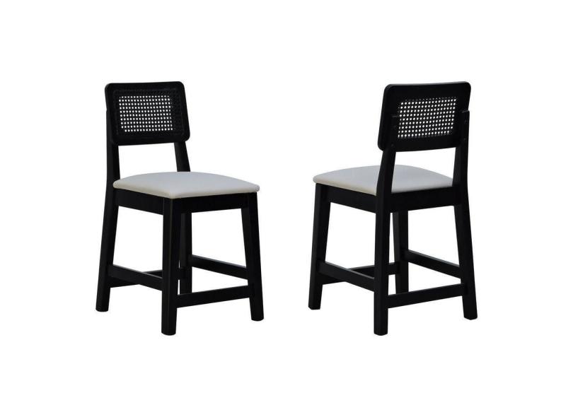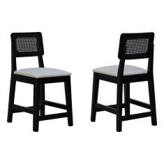 Kit 2 Banquetas Baixa-cadeira Gabi Madeira Maciça Encosto Telinha Assento Estofado - Preto Assento Estofado Corano Bege