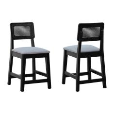 Kit 2 Banquetas Encosto Telinha Assento Estofado - Preto Assento Linho Cinza Mescla Impermeável