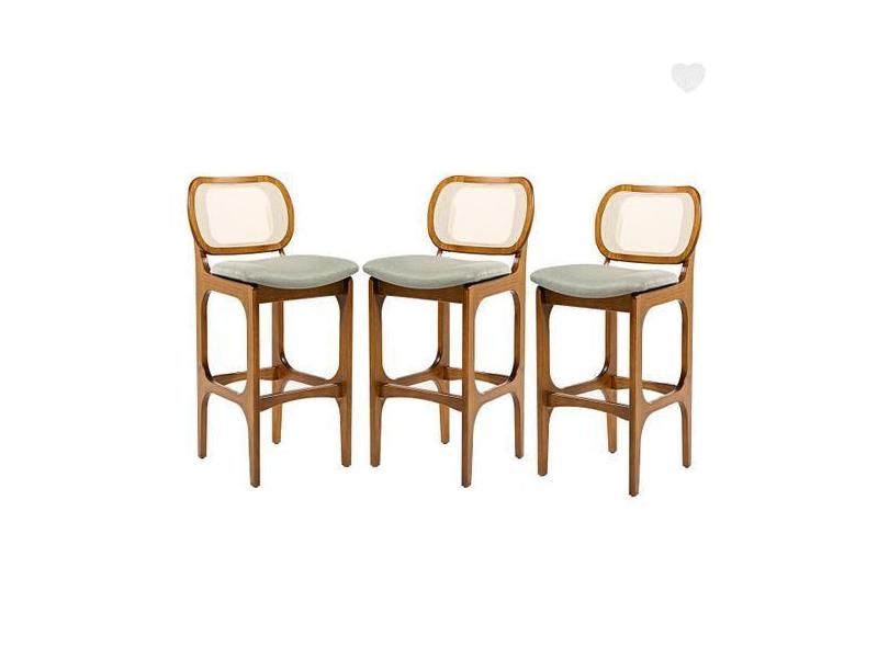 Kit 3 Banquetas Alta com Encosto Rattan Decor Madeira Imbuia Linho Ver