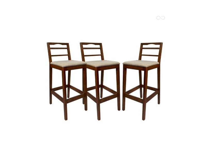 Kit 3 Banquetas Alta de Madeira Estofada Grécia em Madeira Castanho Linho Bege CCS