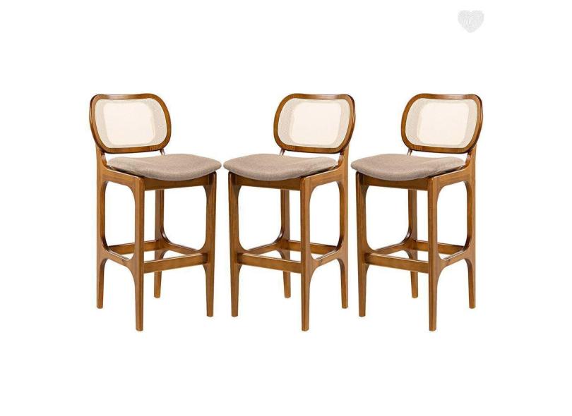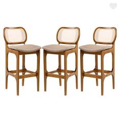 Kit 3 Banquetas Alta Decor Madeira Imbuia Encosto Rattan Linho Marrom L87 RMI