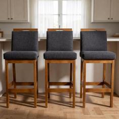 Kit 3 Banquetas Alta Rubi Estofada Tecido Linho Base Madeira Maciça Ca