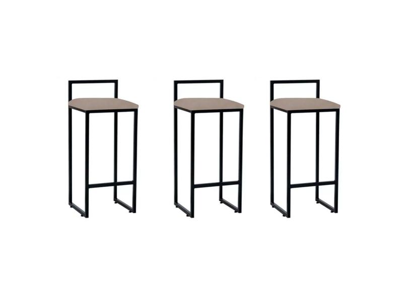 Kit 3 Banquetas Bar Cozinha Bistrô Altas em Aço Industrial Dori Preta Assento Suede Bege