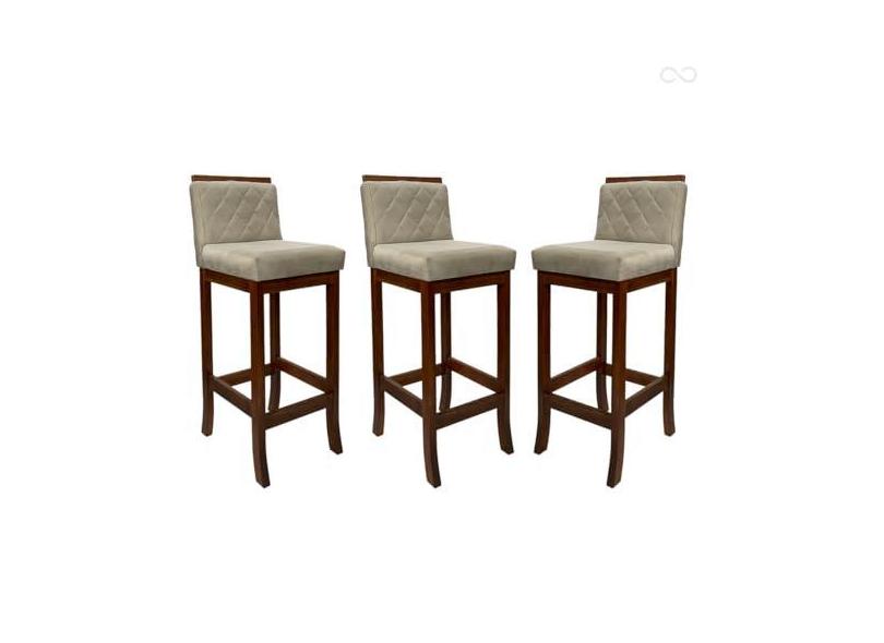 Kit 3 Banquetas Média com Encosto Matelassê Nice Madeira Maciça Suede Bege CCS
