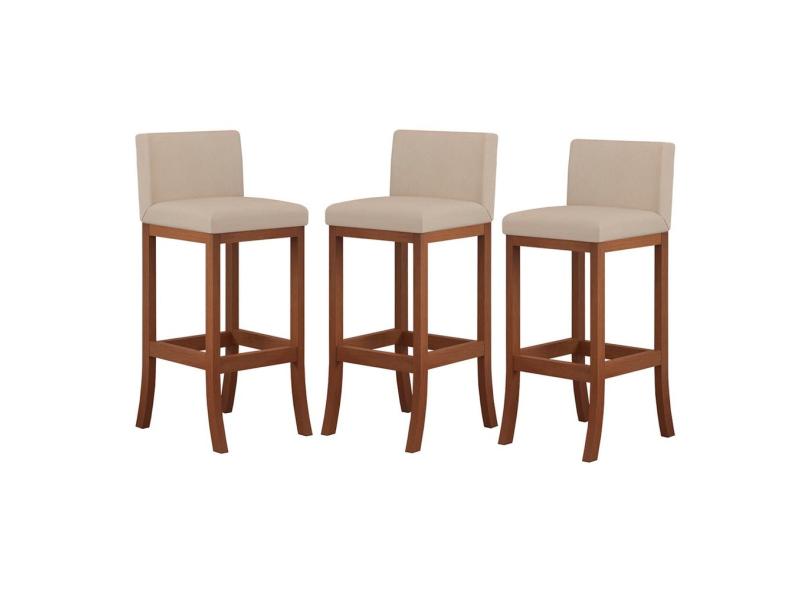 Kit 3 Banquetas Média Encosto Estofado 38x90Cm Ilha Espanha Madeira Maciça Castanho Suede Bege ccs