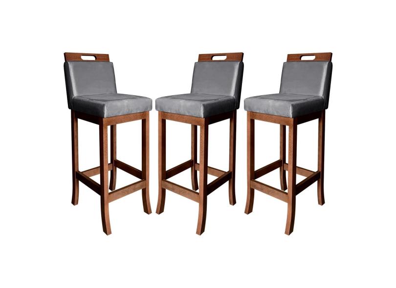 Kit 3 Banquetas Média Estofadas com Encosto Milão Madeira Castanho Suede Cinza ccs