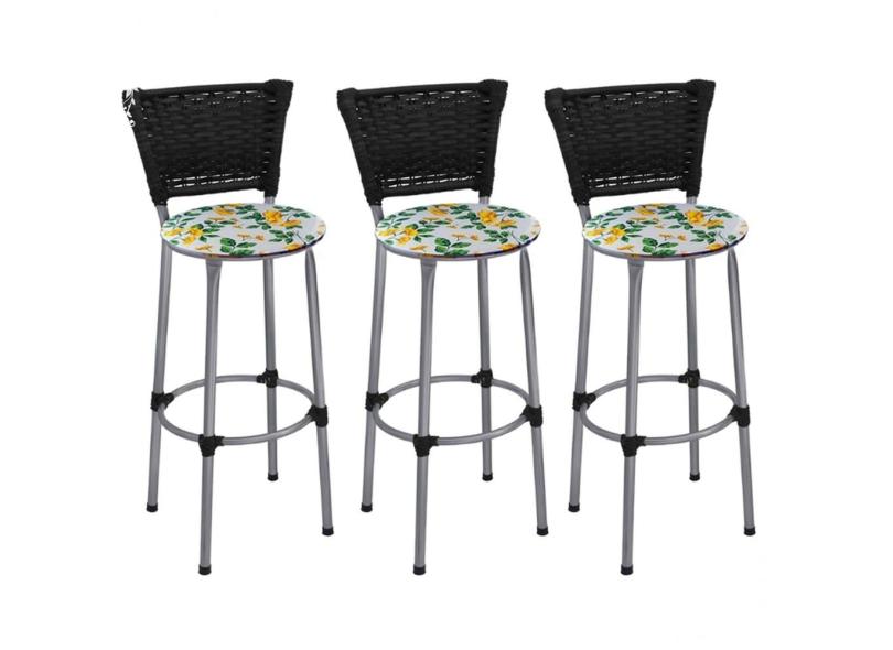Kit 3 Banquetas Médias Prata com Encosto Junco Preto Assento Floral Branco