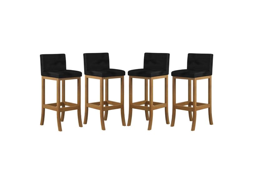 Kit 4 Banquetas Alta Encosto Estofado 38x100 Cm Ilha Espanha Madeira Maciça Amêndoa Suede Preto CCS