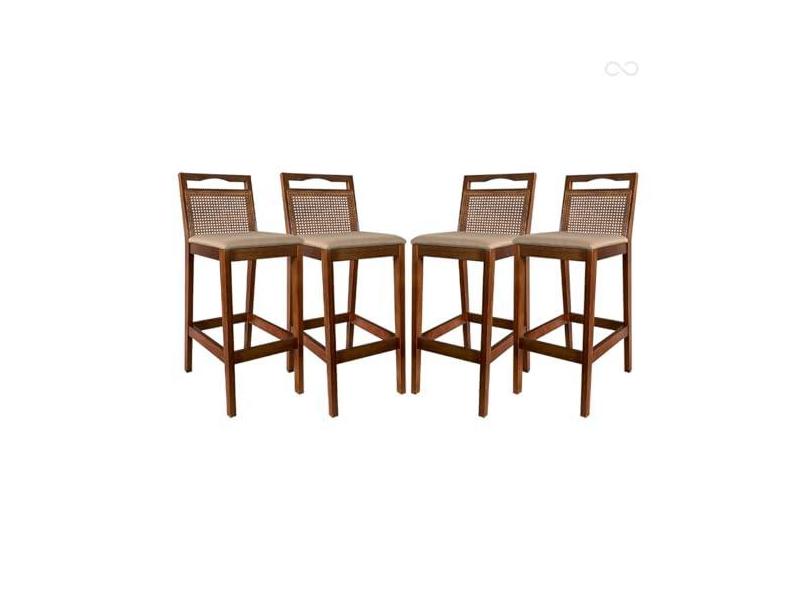 Kit 4 Banquetas Alta para Balcão em Madeira Valência Rattan Castanho Linho Bege CCS