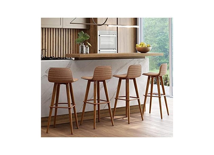 KIT 4 BANQUETAS ALTAS LUXO LINEA AÇO COBRE LINHO TERRACOTA BASE CARVALHO