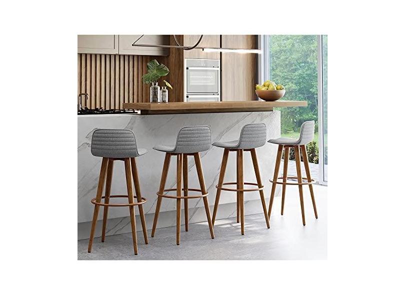 KIT 4 BANQUETAS ALTAS LUXO VERSATIL AÇO COBRE LINHO CINZA BASE CARVALHO